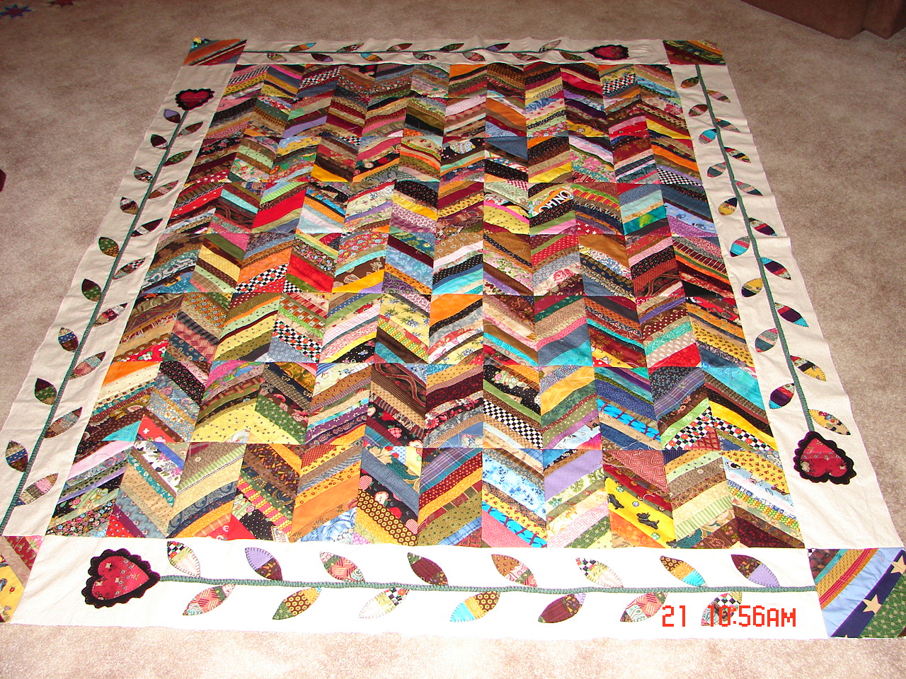 I love the blanket stitch around your appliqued border. It fits well with the "folksy" string quilt, I think. This turned out just wonderful--as do all of your string (and other) quilts.