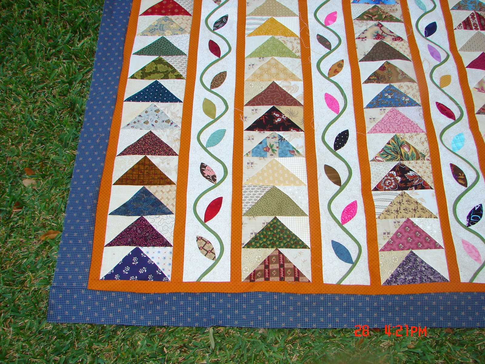 The blue does brings out the bright blues in the flying geese, and makes the other colors a little brighter too. I learned that I really love appliquing these simple leaves, so watch for more of that kind of quilting coming up.